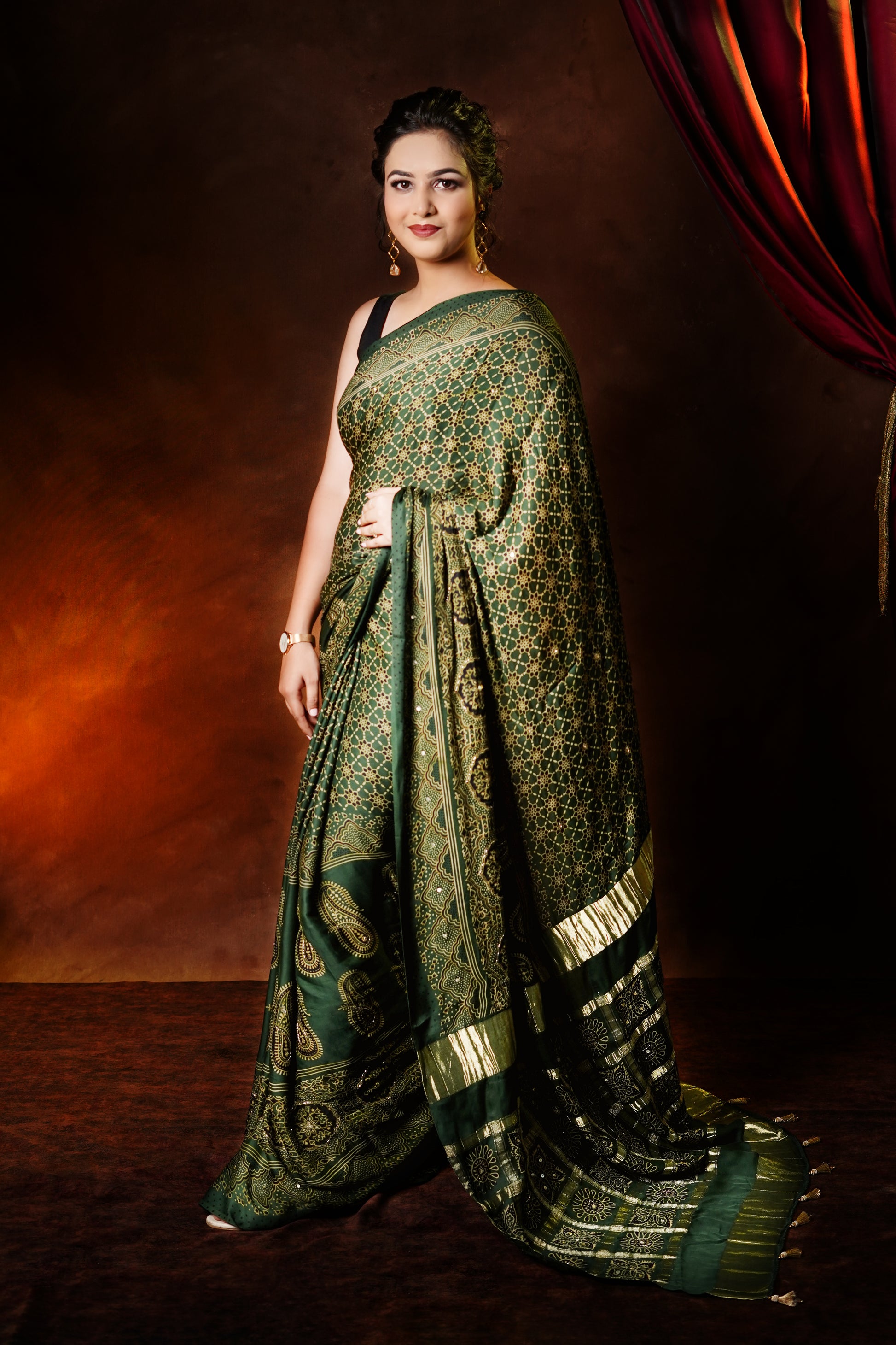 Our Emerald Ghat Aura — a bottle green modal silk block print saree adorned with golden ghat chola weave on the pallu and beautifully handwork done by our artisan .Perfect for weddings, festive gatherings & celebrations of elegance.