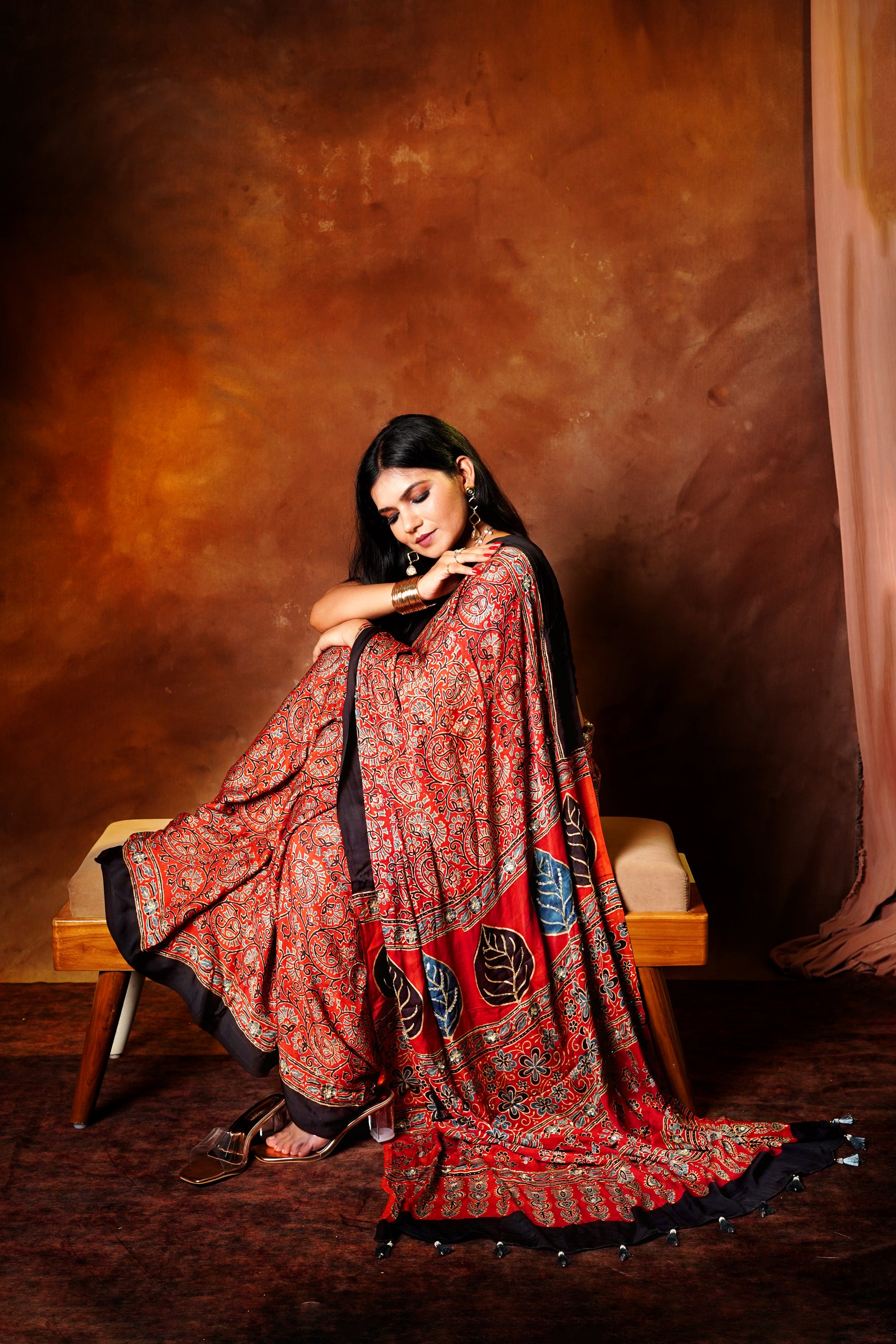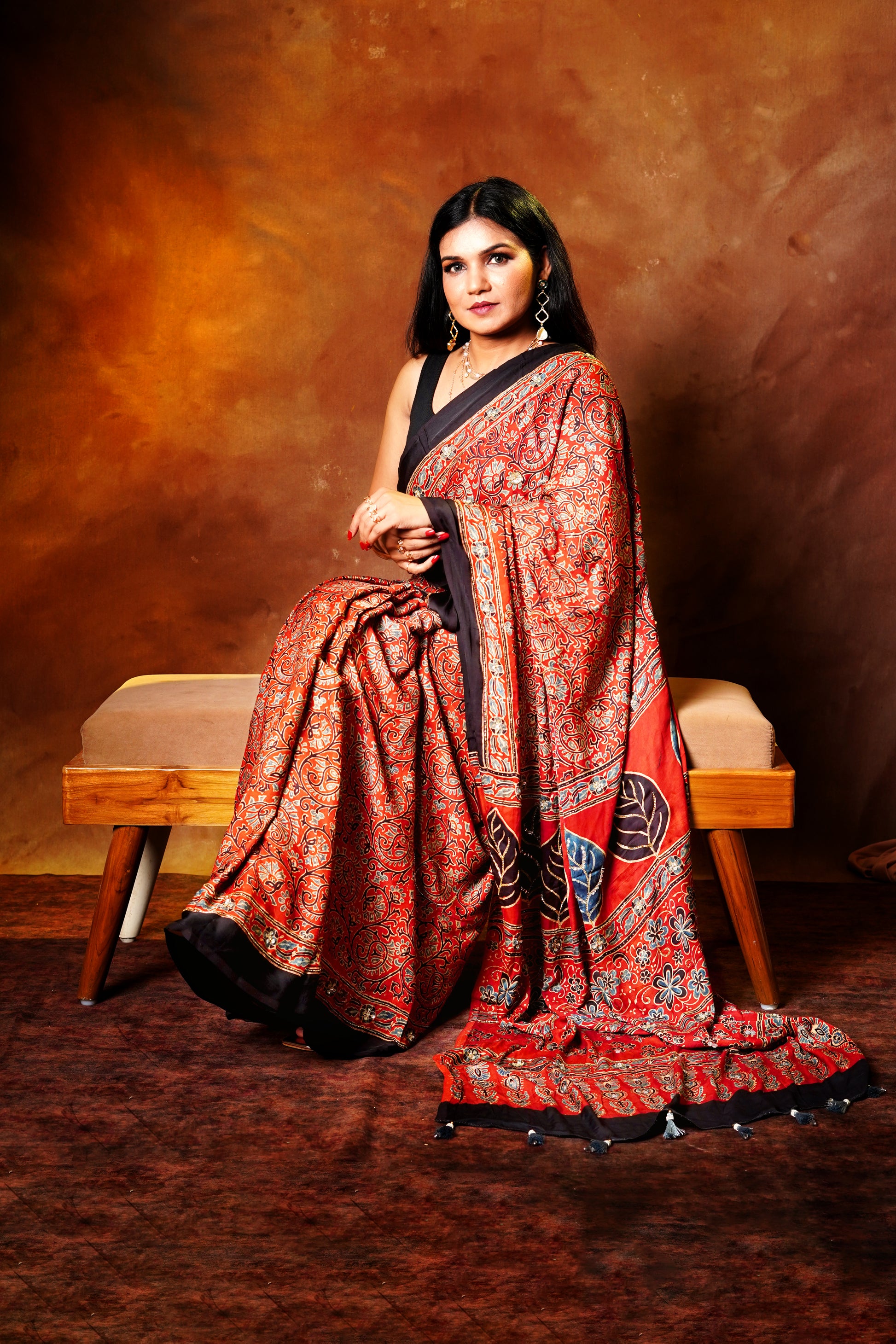 Noor-e-Ajrakh: A pure modal silk saree adorned with delicate handwork of sequins and beads by our skilled artisans .A timeless piece that celebrates elegance and tradition.
